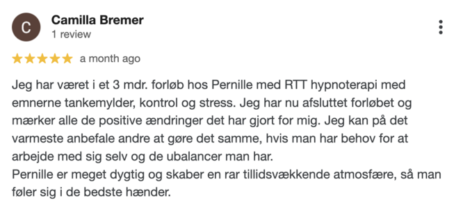 Jeg havde en session med Pernille fordi jeg manglede tiltro til mig selv. Det holdt mig tilbage i mit liv og min forretning. Sessionen var meget dybdegående og Pernille kom hurtigt frem til roden og årsagen til mit problem. Med forståelsen af, hvordan jeg fik min egen tvivl, var jeg i stand til at sætte den bag mig og endelig gå videre. Jeg elskede også at lytte til min personlige optagelse. Tak så meget for min session. Du er så omsorgsfuld og medfølende, og jeg ønsker dig al succes som RTT-terapeut.